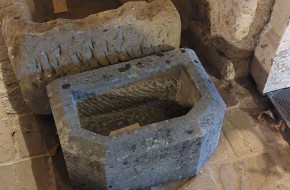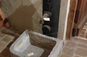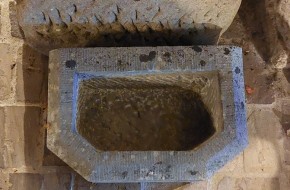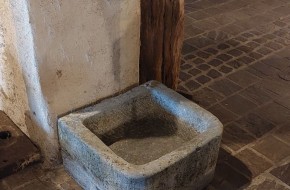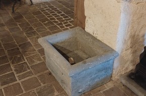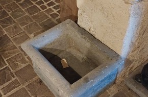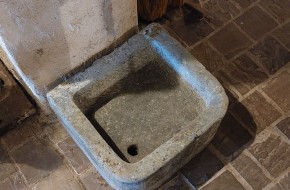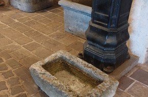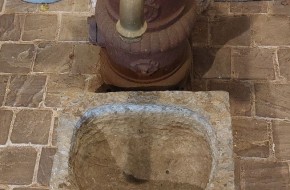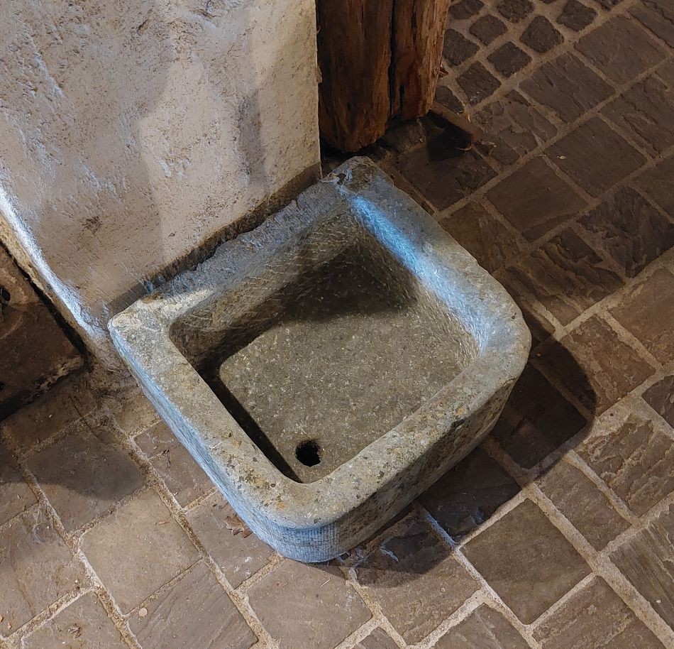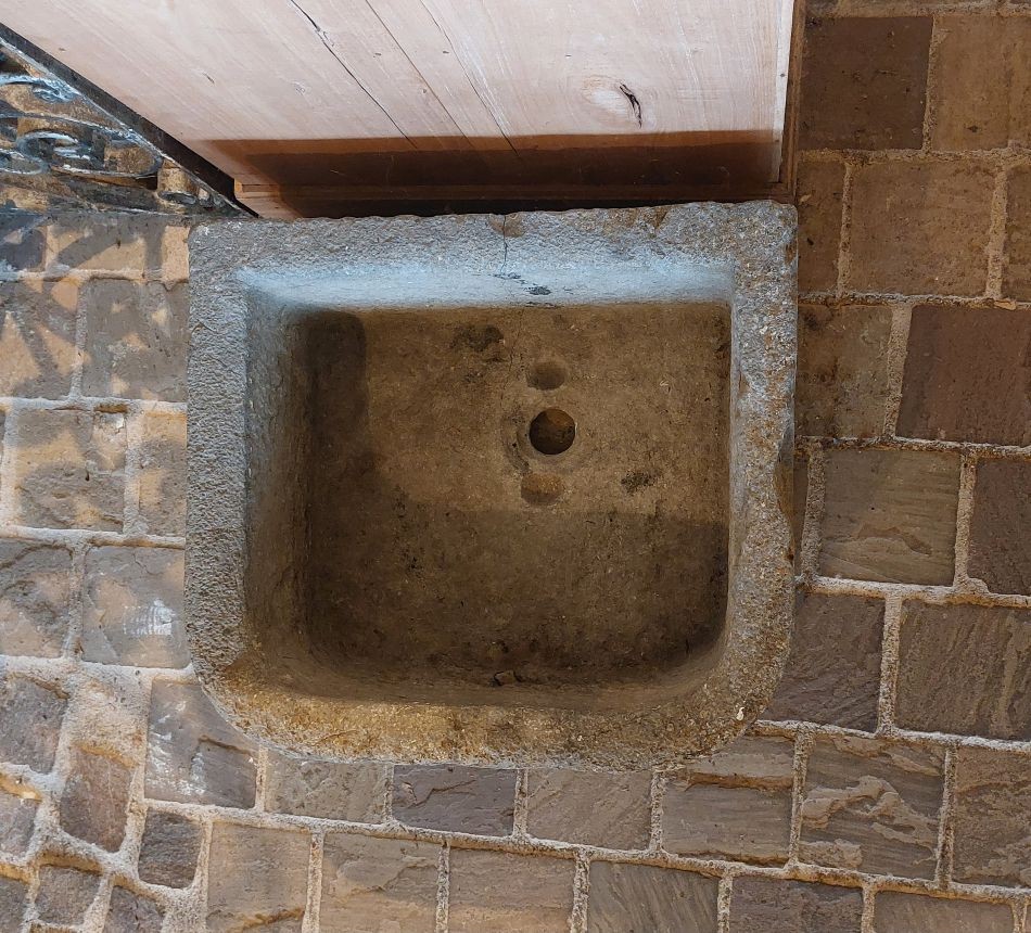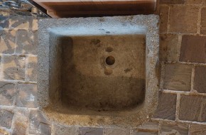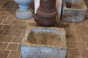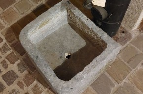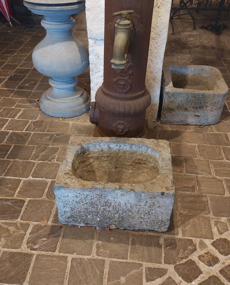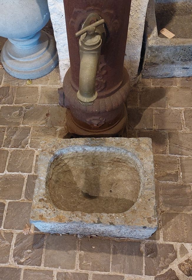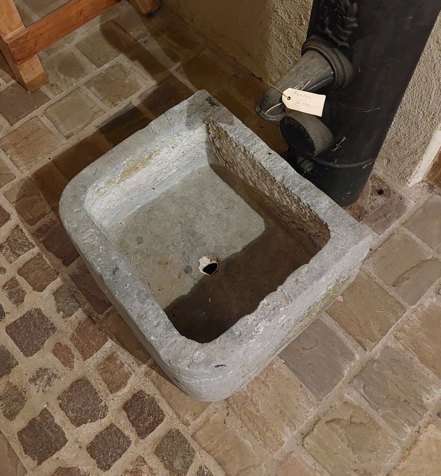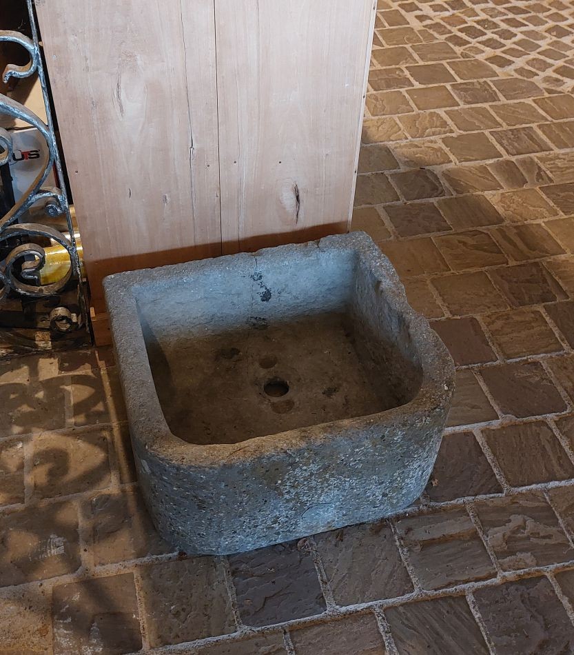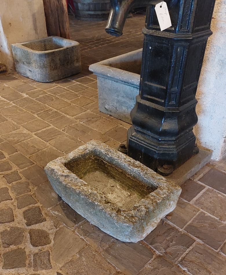 Nr. 39 Leuke niet al te grote hardstenen bak met decoratieve ronde voorkant. Om als pompbak te gebruiken zou er een gat in de bodem geboord moeten worden. Hij is 65 cm breed, 41 cm diep en 19 cm hoog. Prijs € 350,-.