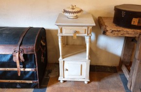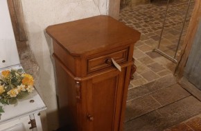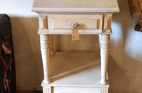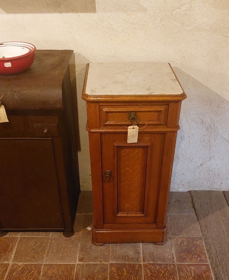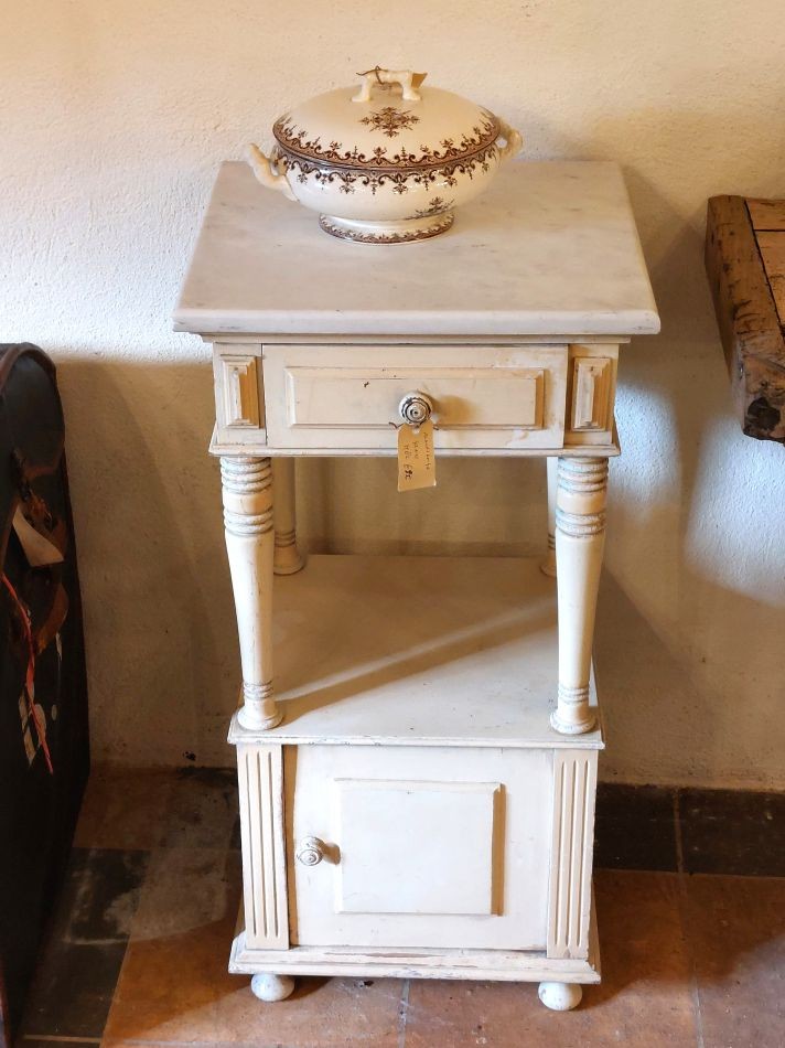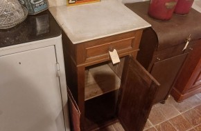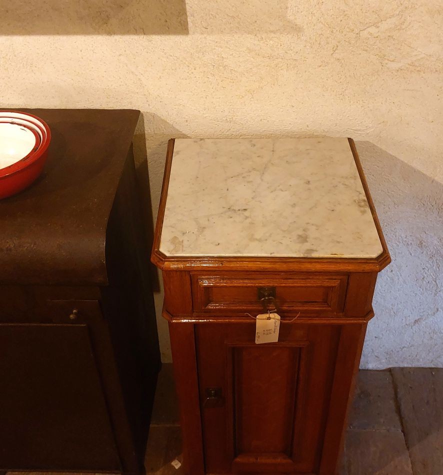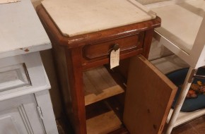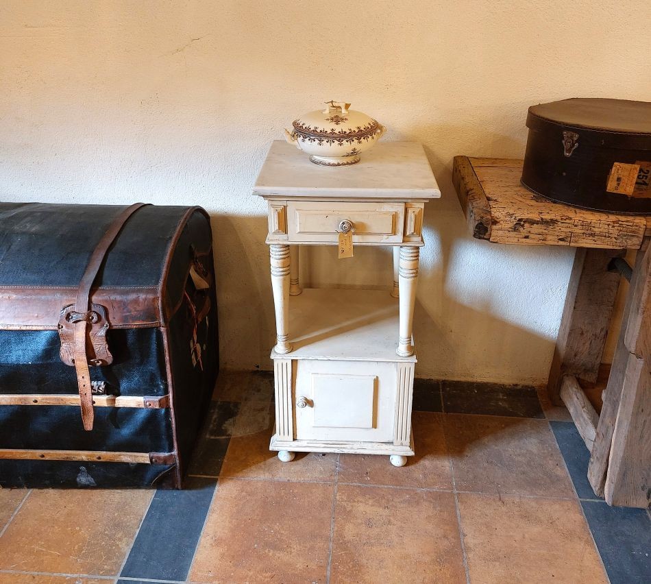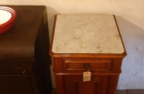 Nr. 41a Praktisch en decoratief. Dit leuke oude nachtkastje heeft een marmeren blad, een lade en bergruimte achter een deurtje. Hij is 42 cm breed en diep en is 82 cm hoog. Hij kost € 95,-. Voor informatie over Vieille France, klik hier.