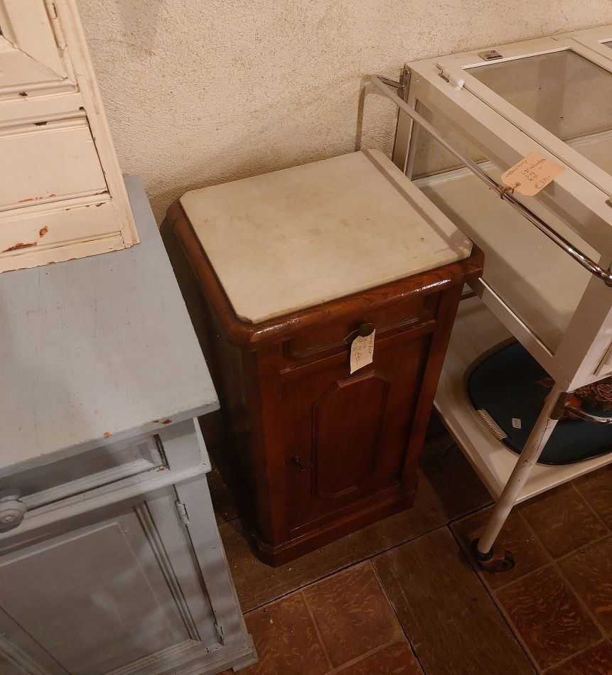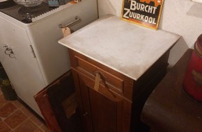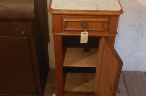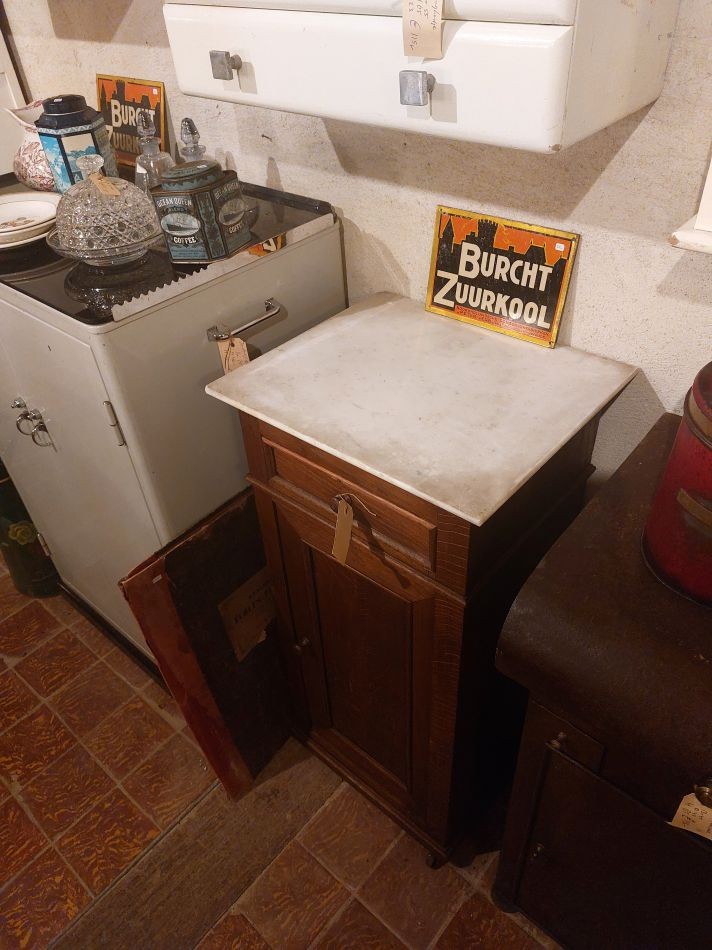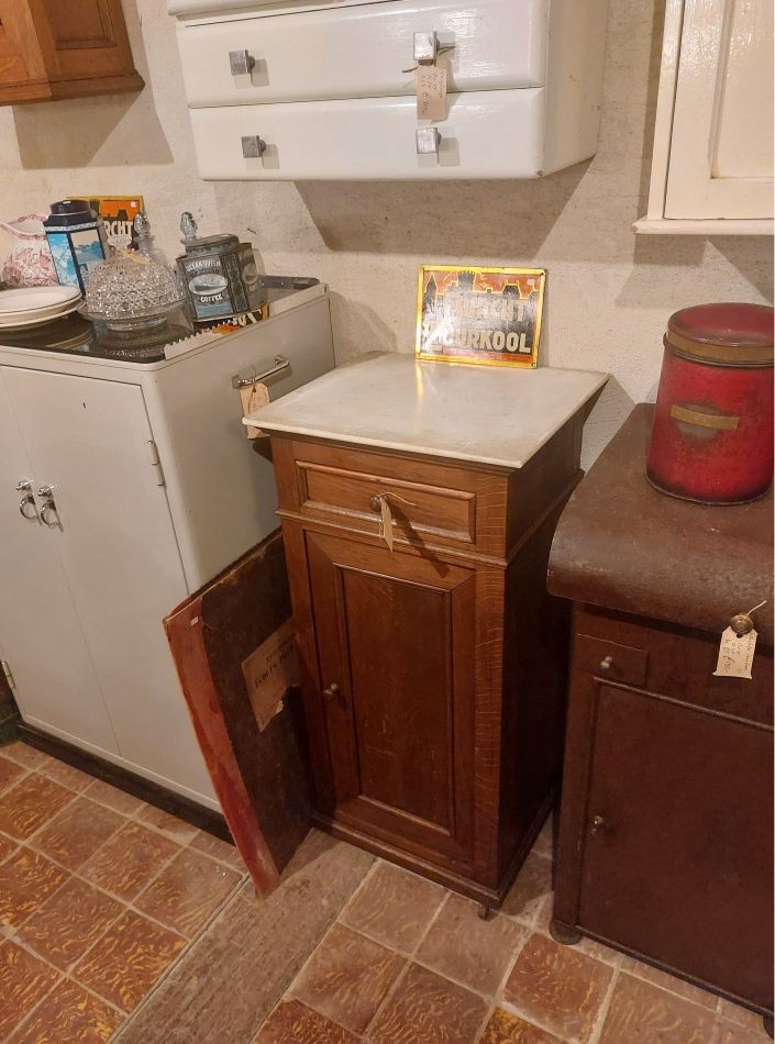 Nr. 38a Oud nachtkastje met originele marmeren blad bovenop. Hij is 90 cm hoog rn 44 cm breed en 38 cm diep. Prijs € 85,-. Zoek je informatie over onze winkel? Klik dan hier.