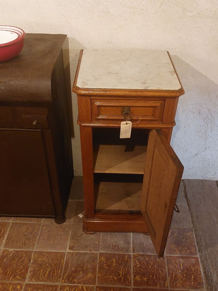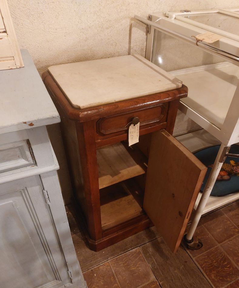 Nr. 40a Mooi oud nachtkastje met marmeren blad. Bergruimte op onderplaat en houten schapje. Hij is 76 cm hoog rn 40 cm breed en 34 cm diep. Prijs € 95,-. Zoek je informatie over onze winkel? Klik dan hier.