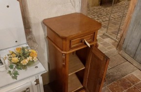 Nr. 37a Mooi oud nachtkastje met aan de voorkant links en rechts een decoratief houten element. Bergruimte op onderplaat en houten schapje. Hij is 81 cm hoog rn 39 cm breed en 34 cm diep. Prijs € 110,-. Zoek je informatie over onze winkel? Klik dan hier.