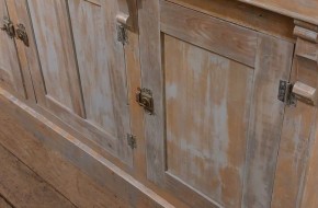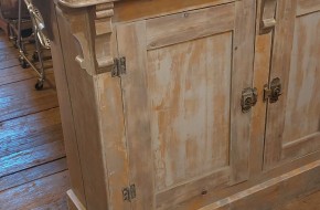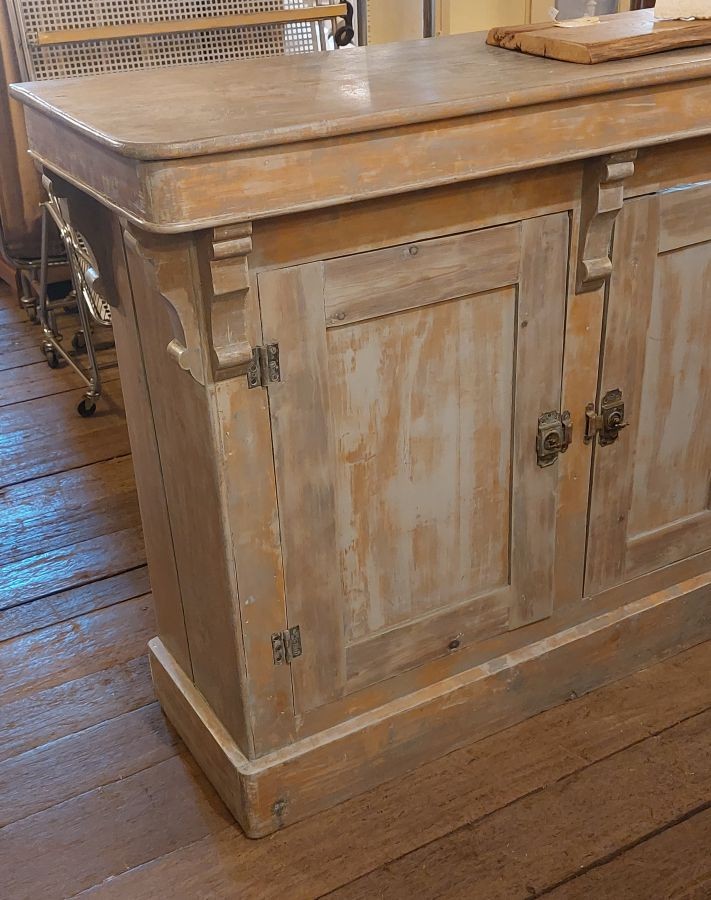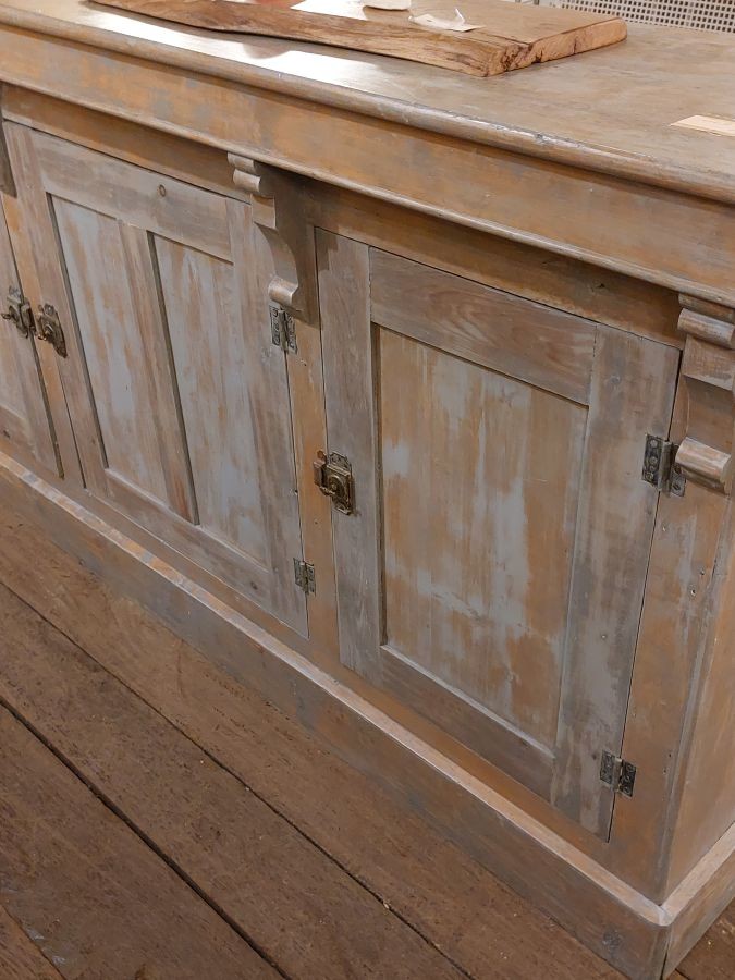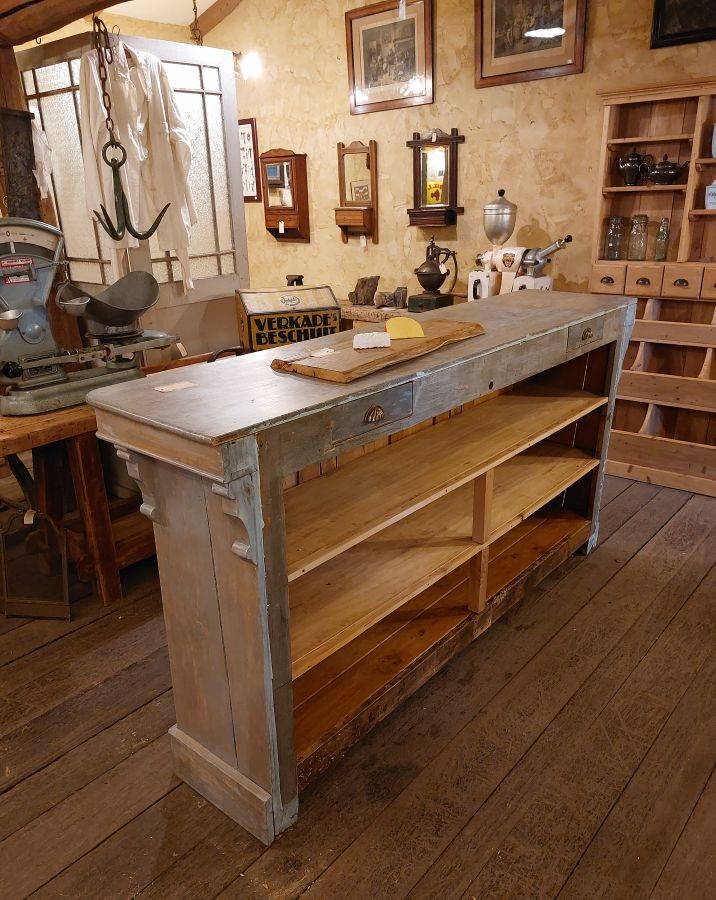 Nr. 82a Leuke oude toonbank met deurtjes. Als laatste waarschijnlijk als 'keukeneiland' omdat de deurtjes nu aan de voorkant zitten. Aan de achterkant zitten 2 laadjes. Over de hele lengte bergruimte op 2 schappen en op de bodemplaat.