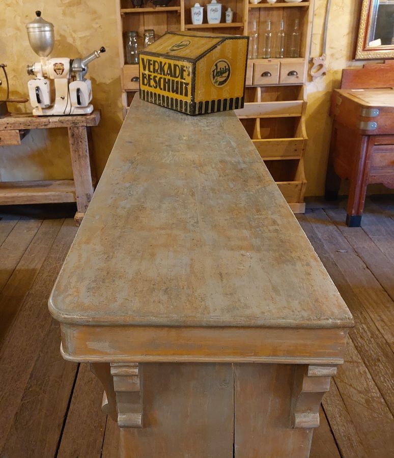Nr. 50a Relatief kleine / korte oude toonbank. Achter vind je een lade en een legplank. Hij is 146 cm lang, 49 cm diep en 95 cm hoog. Prijs € 975,-. Voor informatie over de winkel, klik hier.