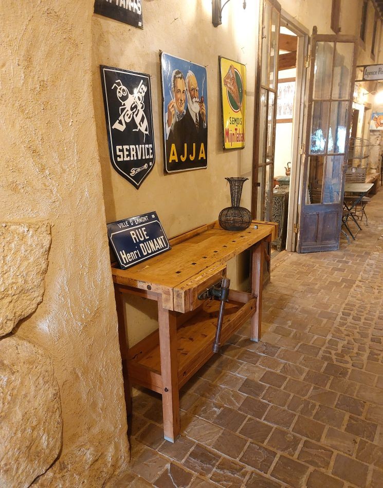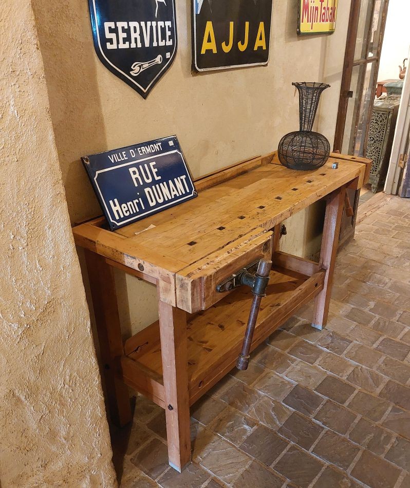 Nr. 462a Ben je op zoek naar een donkere werkbank, deze staat nu in de winkel. Hij heeft een bankschroef, onderblad en door het bovenblad een oude smeedijzeren klem. Dat blokje onder de klem kun je er afhalen en de klem kun je als je wilt eruit trekken.