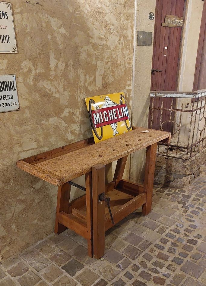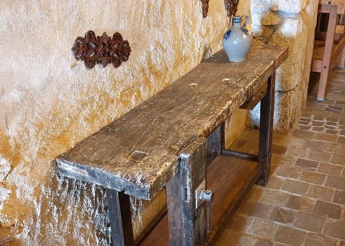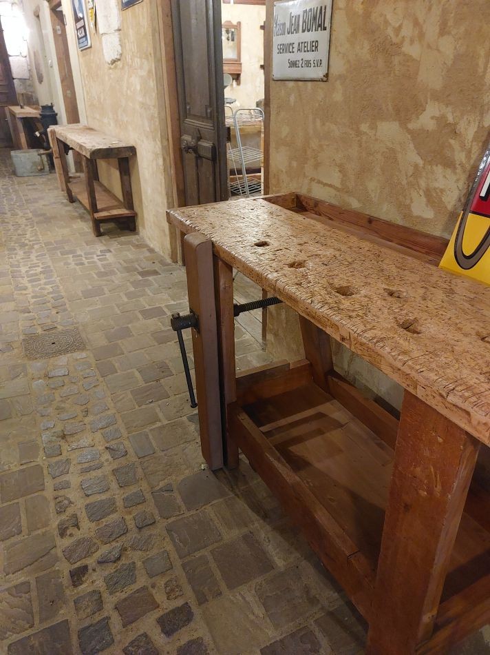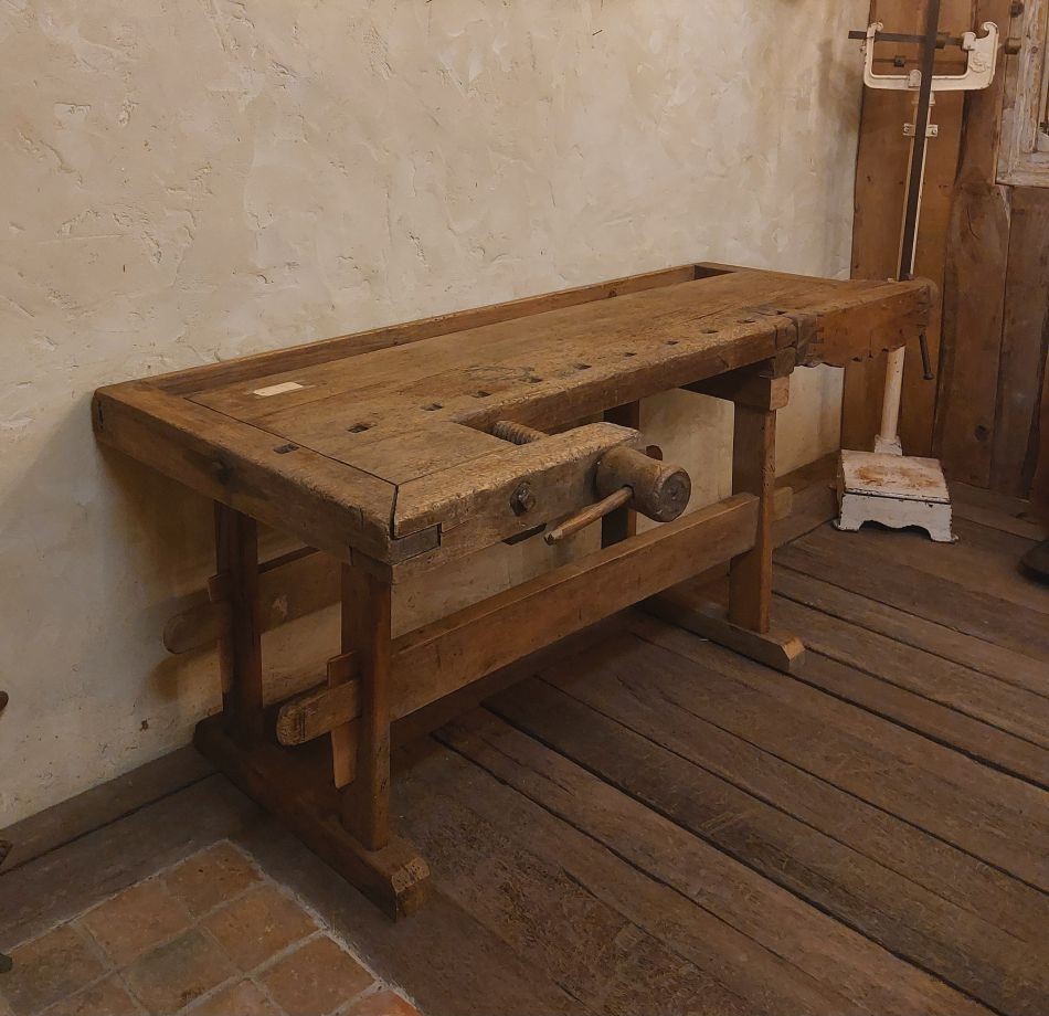 Nr. 459a Middelgrote oude werkbank. Zoals je kunt zien heeft hij een onderblad en een bankschroef. Het blad heeft achteraan een smalle 'bak'over de hele lengte.