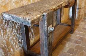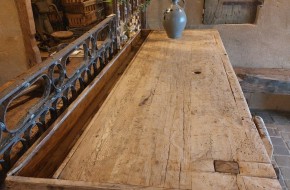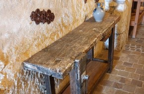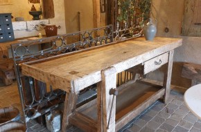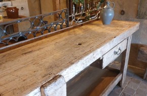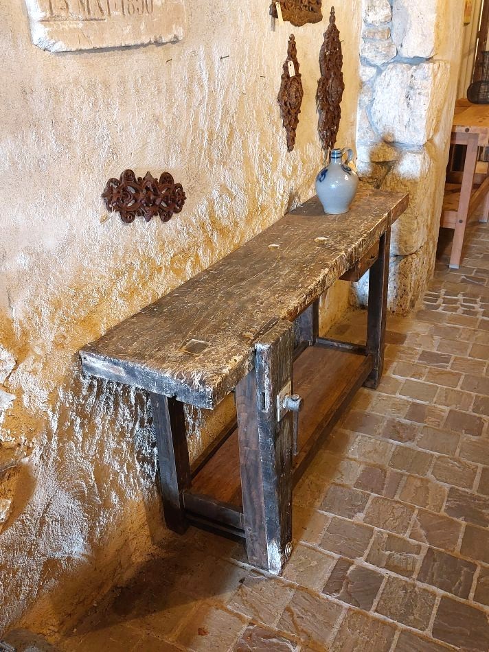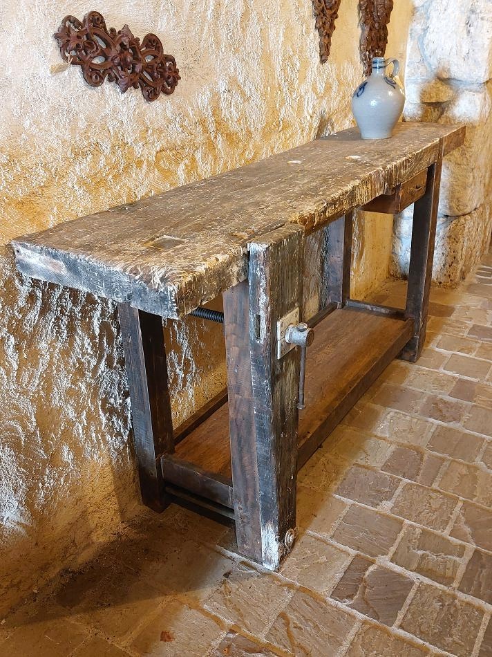 Nr. 469a Deze robuuste werkbank is 225 cm lang, 75 cm diep en 93 cm hoog. Naast dat hij geschikt is als sidetable, is deze door zijn formaat ook prima bruikbaar als keukenwerkblad. Deze werkbank heeft een bankschroef, onderblad en lade. Prijs € 950,-.