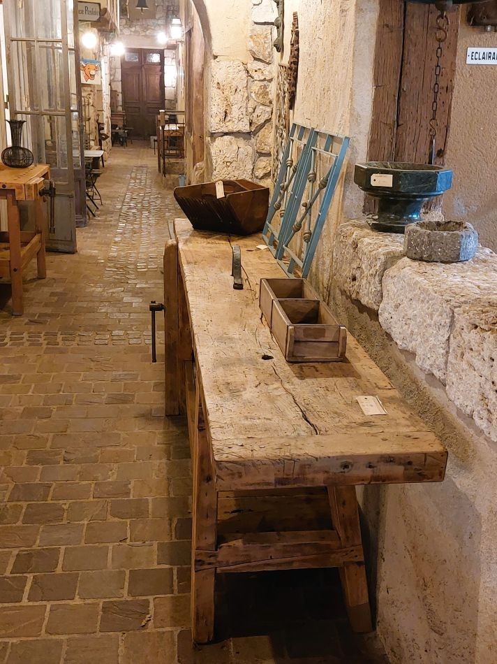 Hij is wat donkerder van kleur dan de meeste werkbanken en zijn blad is mooi doorleefd. Deze werkbank is 149 cm lang, 51diep en 86 cm hoog. Prijs € 750,-. Voor informatie over onze winkel, klik hier.