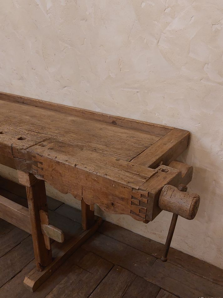 VERKOCHT Nr. 458a Middelgrote oude werkbank. Zoals je kunt zien heeft hij een onderblad en een bankschroef. Een leuk detail is de oude klem die in het werkblad zit. Met deze werkbankklem werd een stuk hout waarmee men bezig was op de werkbank geklemd. Liever niet? Dan trek je hem eenvoudig uit het blad.