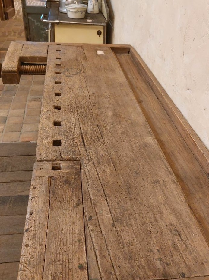 Deze werkbank is 201 cm lang, 43 cm diep en 83 cm hoog. Prijs € 775,-. Voor informatie over openingstijden en dergelijke, klik hier.