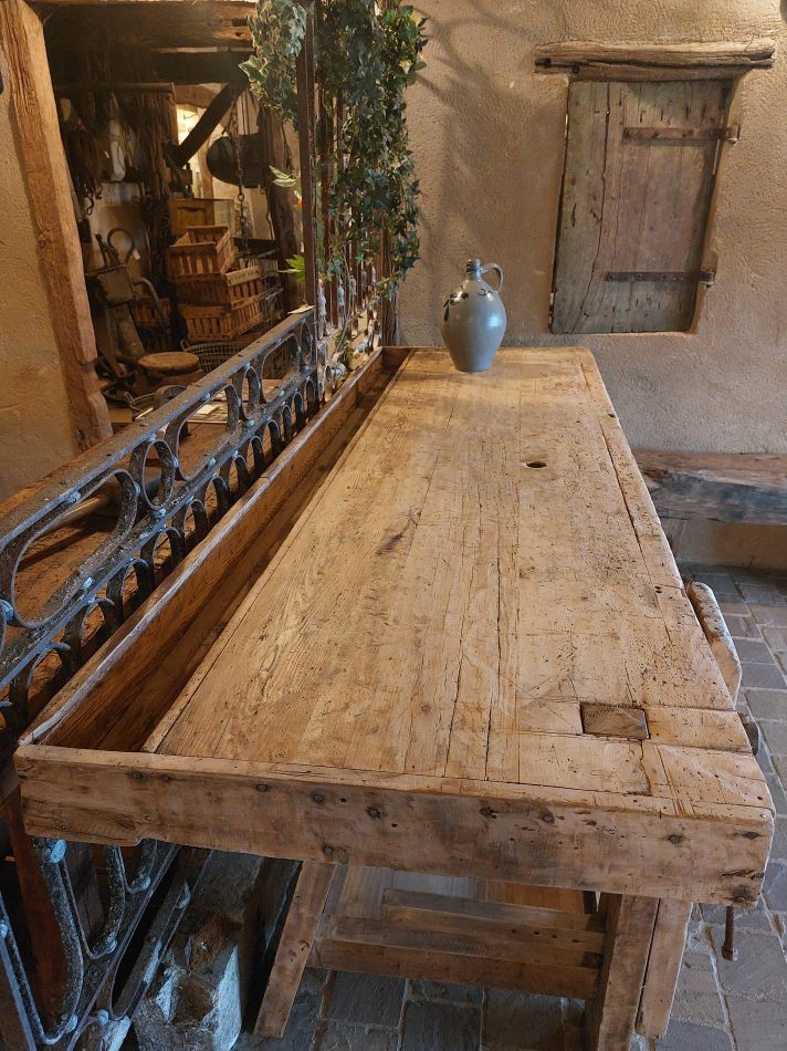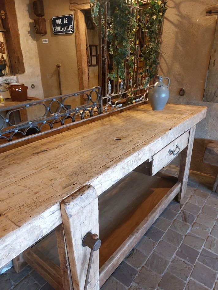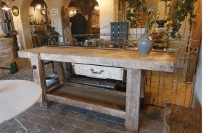 Nr. 435a Dit zijn nieuwe foto's van een werkbank die al in de winkel stond. De foto's daarvan op de website, waren niet echt denderend, vandaar deze nieuwe foto's. Deze grote werkbank heeft een mooi doorleefd blad en een onderblad. Hij is 215 cm lang, 50 cm breed en 80 cm hoog. Hij kost € 750,-. Voor informatie over onze winkel, klik je hier.
