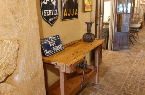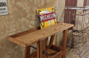 Nr. 454a Hier is dan weer een langere, relatief lage, werkbank met bankschroef en onderblad. Hij heeft een doorleefd bovenblad waarin een oude klem zit. Is dit niks voor jou dan trek je hem eenvoudig eruit. Deze werkbank is 230 cm lang, 41 cm diep en 70 cm hoog. Prijs €850,-. Voor informatie over de winkel, klik hier.
