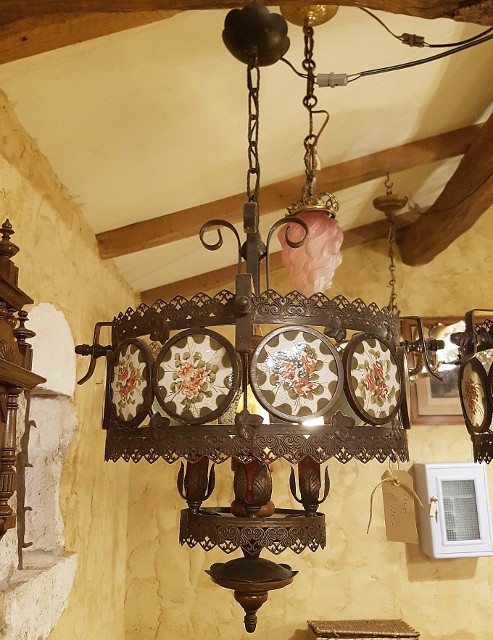 nr. 28a Wat ik zo mooi vind aan deze kroonluchter is dat werkelijk ieder onderdeel gedecoreerd is. Bij de schaaltjes onder de 'kaarsjes' is bijvoorbeeld de bovenkant roze en de onderkant gebloemd. Ook de 5 koperen armen zijn gedecoreerd. De kroonluchter is ongeveer 86 cm hoog en 70 cm breed. Prijs € 225,-. Voor informatie over onze winkel, klik hier.
