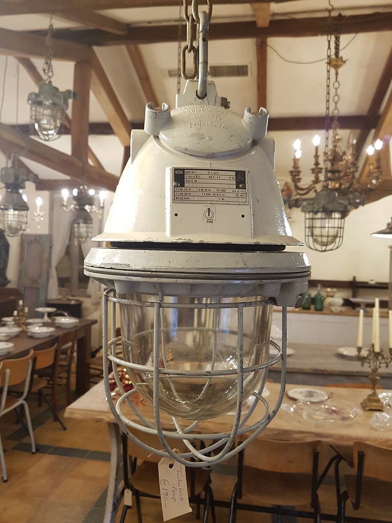 Nr. 14 Stoere industriële lamp, uit zelfde serie als volgende lamp, voor binnen of buiten onder een afdakje. Hij kost € 135,-.