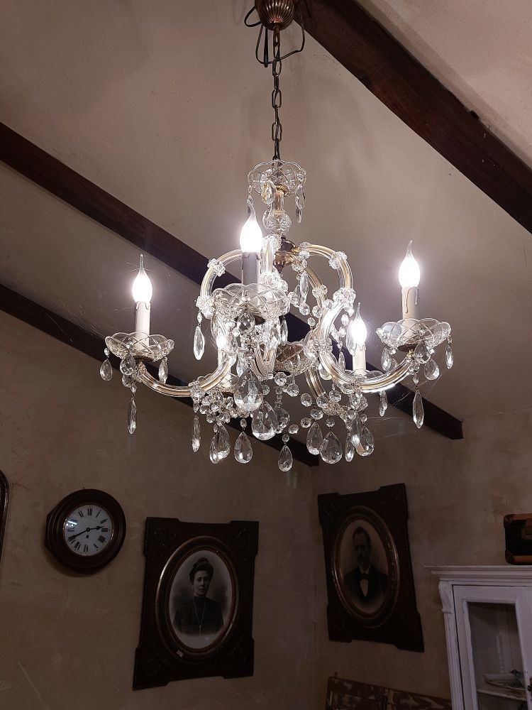 Nr. 24 Kleine oude kristallen kroonluchter. Hij is ongeveer 50 cm breed en 45 cm hoog. Prijs € 395,-.