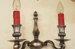 Nr. 19a Oude tinnen kroonluchter, zilverkleurige kroonluchter met 8 lichtpunten. De 'kaarsjes' zijn nu rood maar kunnen desgewenst vervangen worden door witte. Bij deze lamp horen 2 wandlampjes. Prijs € 250,-.