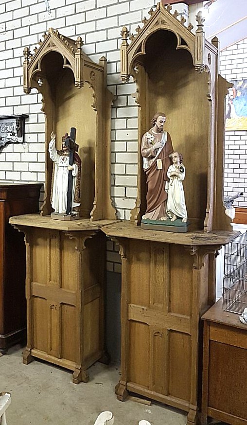 Deze komen zelden/niet op de markt en zeker geen paar. Dit zijn twee originele antieke gotische beeldenconsoles afkomstig uit een kerk. Gezien de leeftijd zijn ze in goede staat. Het vlak waar de beelden op staan heeft wat vlekken.
