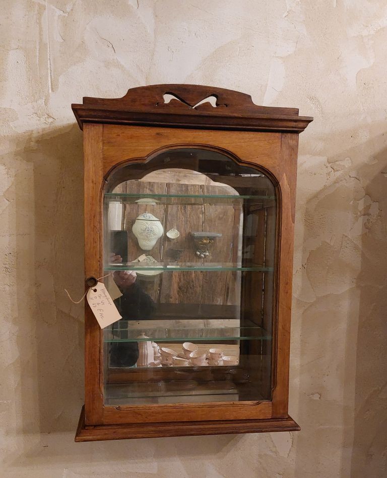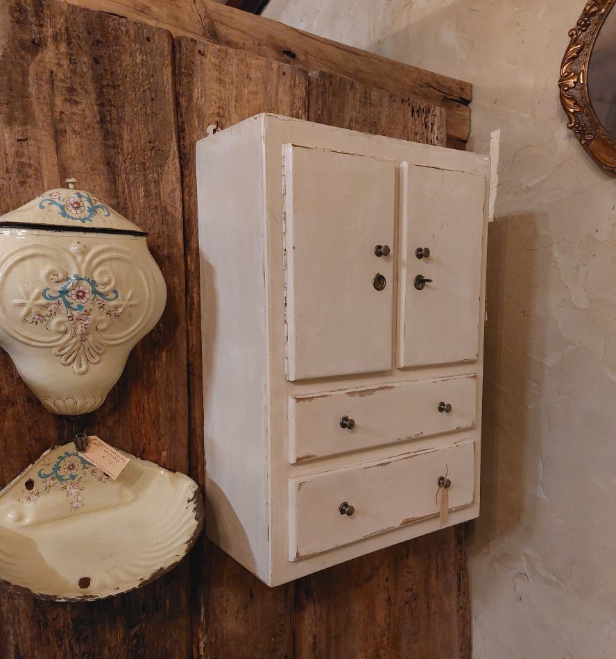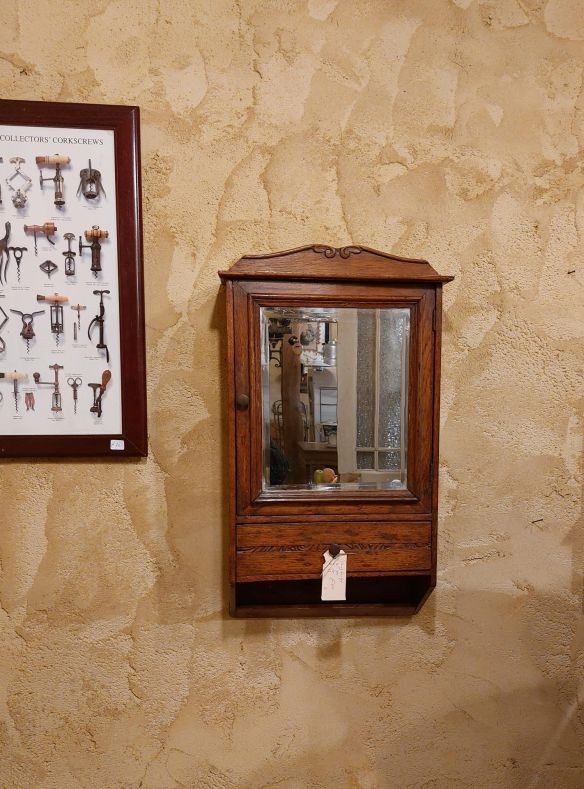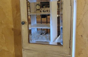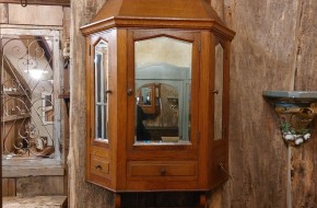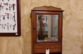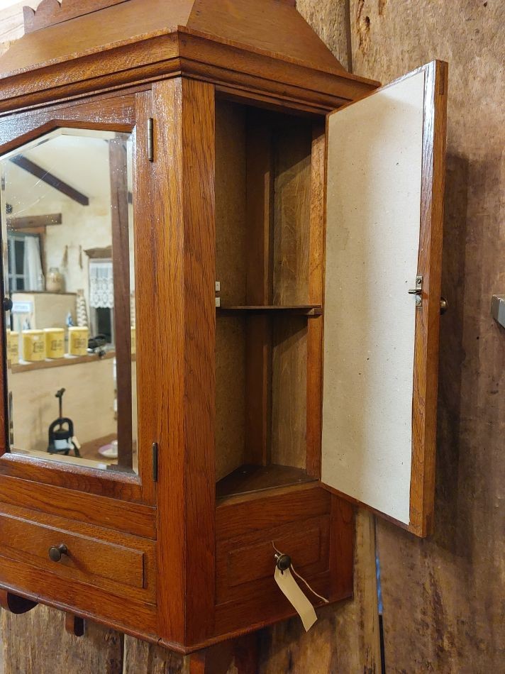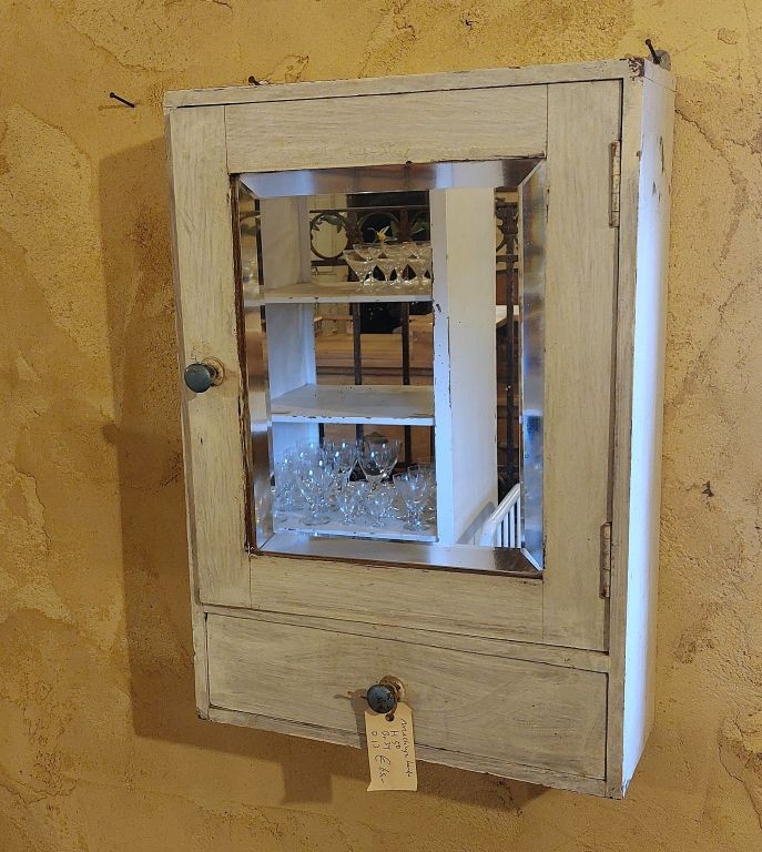 Nr. 68a Heel apart oud hangkastje. Voor het eerst gezien in 25 jaar Vieille France. Dit kastje heeft 3 spiegels. Een grotere op het deurtje aan de voorkant en aan de zijkanten zit ook een deurtje met spiegel. Aan de voorzijde zit er nog een lade. Aan beide zijdes zit een 'neplade' oftewel alleen maar een frontje.