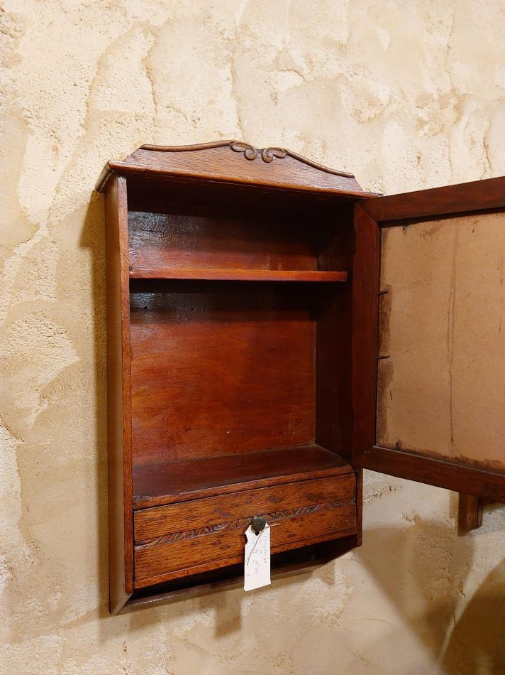 Nr. 46 Mooi oud hangkastje met spiegel en lade. Hij is 31 cm breed, 58 cm hoog en 17 cm diep. Achter het deurtje vind je een schapje. Prijs € 75,-.