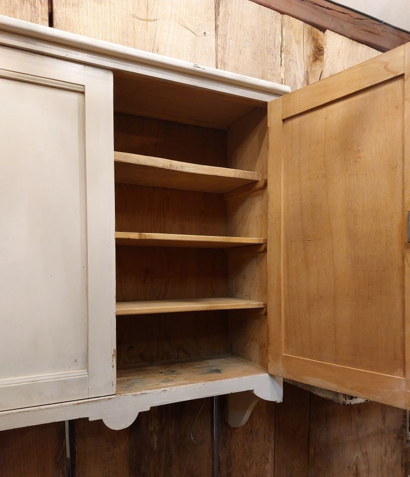 Nr. 70a Oud relatief groot medicijnkastje / hangkastje. Hij heeft bergruimte achter 2 deurtjes waarachter 3 legplanken zitten. De wat donkerder plekken voorop dit kastje, zijn schaduwplekken.