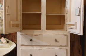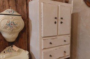 Dit oude kastje heeft bergruimte achter 2 deurtjes en in 2 lades. Er is 1 sleutel bij. Kastje is oud en heeft wat slijtageplekken in de verflaag. Hij is 80 cm hoog, 55 cm breed en 28 cm diep. Prijs € 145,-. Voor informatie over de winkel, klik hier.