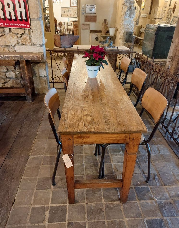 We hadden al eerder 2 vergelijkbare oude schooltafels. Ideaal wanneer je een tafel zoekt die wel lang is maar niet breed. Hij is namelijk 235 cm lang, 56 cm breed en 78 cm hoog.