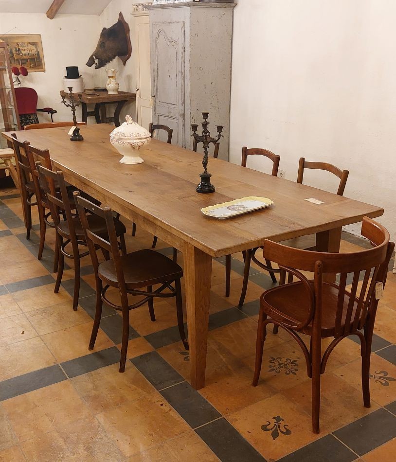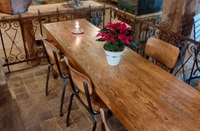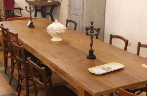Deze hangemaakte tafel is maar liefst 320 cm lang. Zijn breedte is 94 cm en de hoogte is 78. Prijs € 1850,-. Informatie over onze winkel? Klik hier.