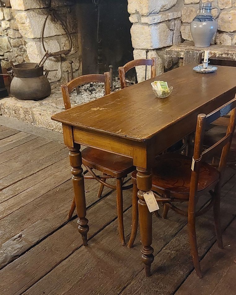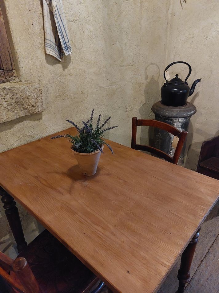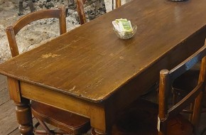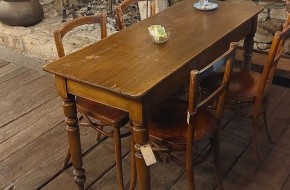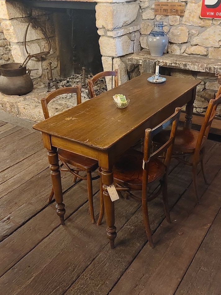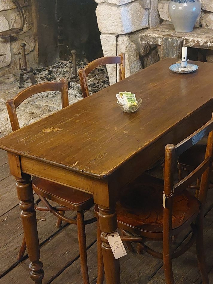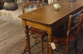 VERKOCHT Nr. 101a Nieuw in onze koffiehoek bij de open haard, dit leuke smalle keukentafeltje, Kan natuurlijk ook gebruikt worden als cafétafel, sidetable etc. Hij heeft hier aan daar wat slijtage sporen maar niets wat stoort. Deze tafel is 135 cm lang, 48 cm breed en 78 cm hoog en kost € 295,-. Voor informatie over onze winkel, klik hier.